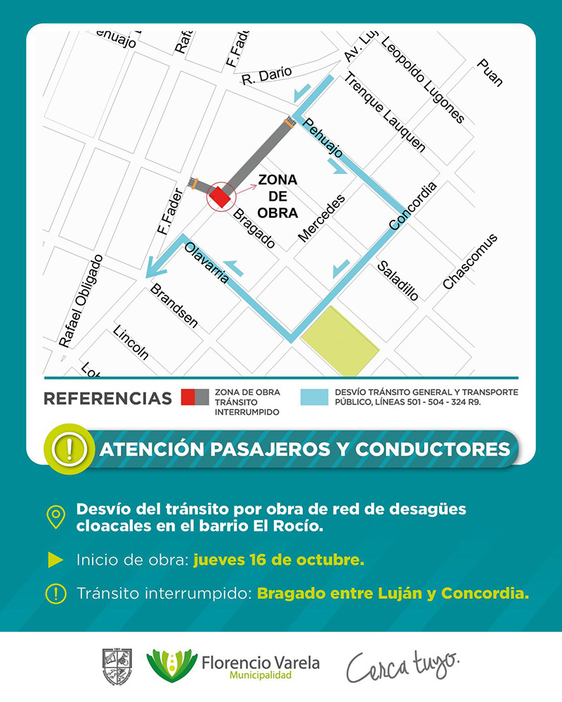 Debido a la instalación del sistema de desagües cloacales sobre calle Bragado, la Comuna notifica la interrupción de la circulación vehicular en el cruce de la mencionada arteria con Luján el jueves 16 de octubre de 8.30 a 16 hs.