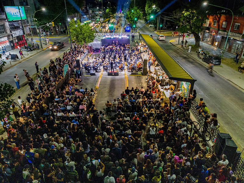 En la esquina de Dorrego, estaba el escenario central con un fondo distintivo para las y los residentes del partido: el Monumento a la Bandera. En semicírculo, el ensamble comunal afinó sus instrumentos. La llegada del maestro Darío Domínguez Xodo marcó el inicio.