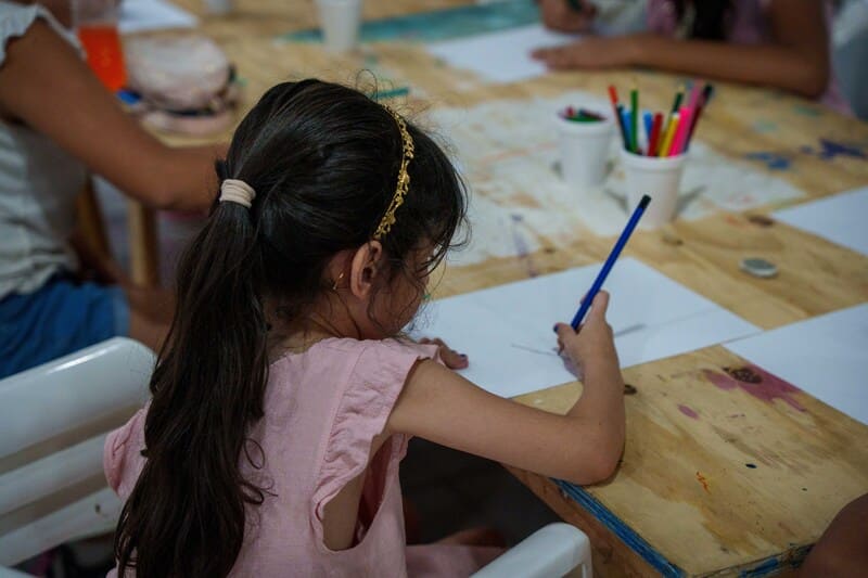 “Aprovecho que son las vacaciones y vengo con mi nena”, cuenta Virginia Villanueva. “Es súper importante para alejarla del celular, expresarse y estar en contacto con sus pares”, añade la frentista de KM26,700.
