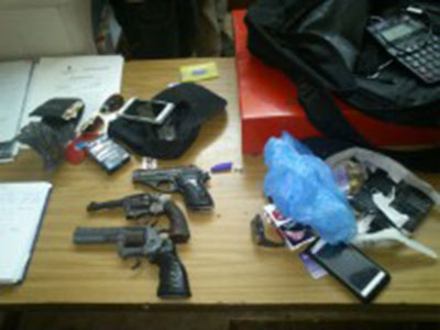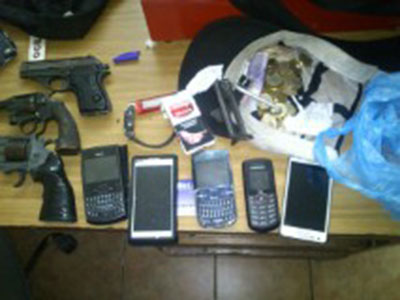 Minutos más, tarde personal policial ingresa al lugar en cuestión y logra aprehender a los dos sujetos. A uno de ellos se le secuestra un revolver calibre 32, dinero en efectivo, una bolsa de monedas, un equipo nextel y un celular. En tanto, la otra persona fue detenida tras secuestrarle una pistola semiautomática calibre 22 sin numeración y 2 teléfonos celulares.