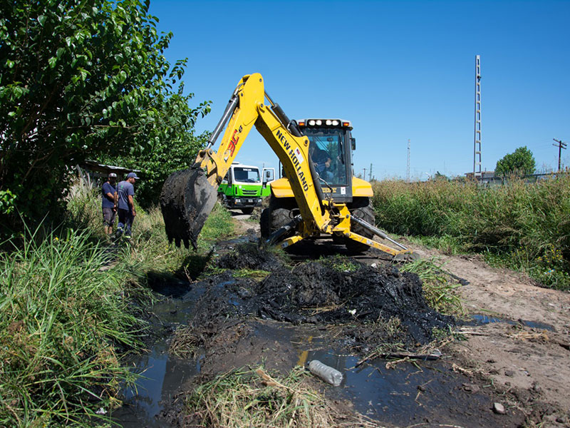 En Villa Argentina se hicieron trabajos de zanjeo sobre la calle Los Tilos, entre 511 y 507. Mediante una grúa se procedió al retiro de barro y ramas acumuladas que producen la obstrucción de las zanjas. A su vez, se continúan con estos trabajos en el barrio Pico de Oro, sobre la calle Berna (entre Polonia y Sicilia).