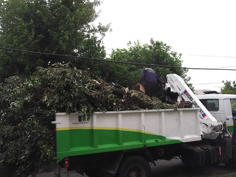 Sobre la calle San Nicolás en su cruce con Rosario, se recolectaron residuos y ramas que habían sido arrojadas en las calles y veredas. Para la labor, se utilizaron tractores que agilizan el traslado de grandes volúmenes de basura a los camiones.