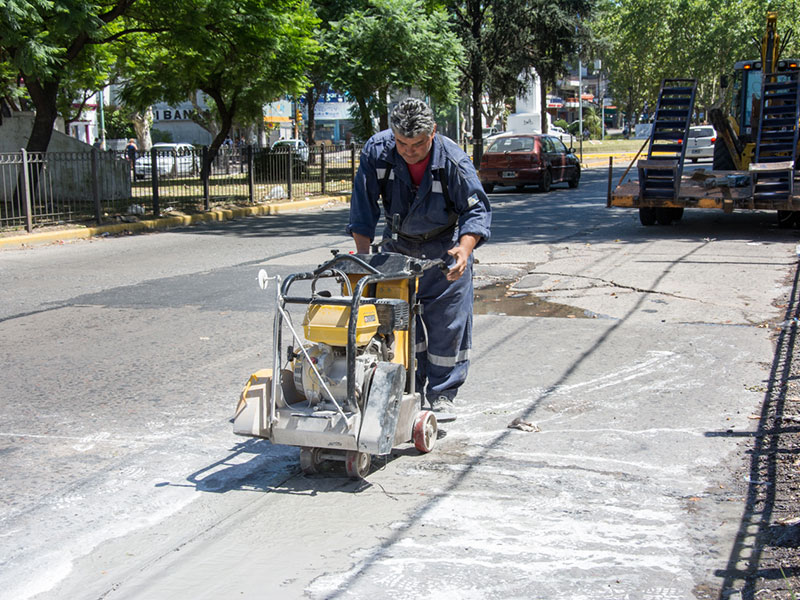 En el lugar, se procedió al aserrado y desmonte sobre dos baches, y se preparó el suelo para posteriormente proceder al rellenado con homigón.