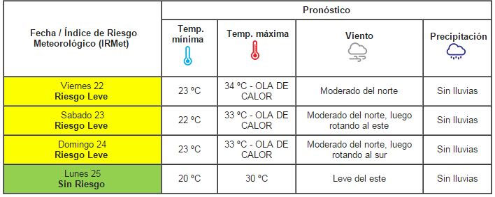 La Municipalidad de F. Varela informa, a través del Sistema de Prevención Meteorológica Municipal “MeteoVarela”, y en base a datos suministrados por el Servicio Meteorológico Nacional (SMN), la perspectiva meteorológica para los próximos días, donde se esperan una ola de calor para el viernes, sábado y domingo, con temperaturas máximas de 34 grados centígrados