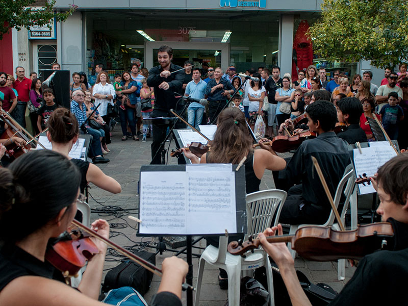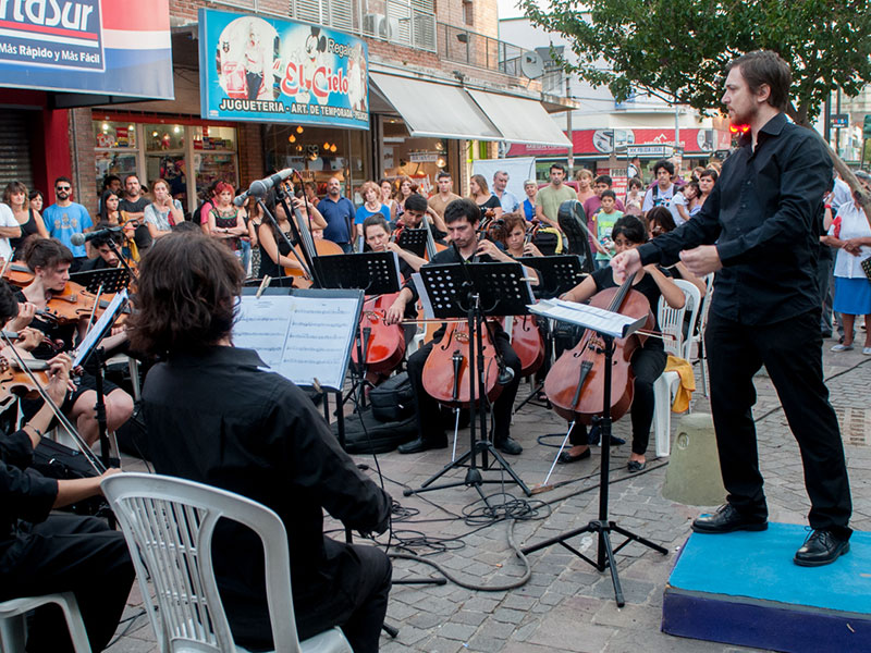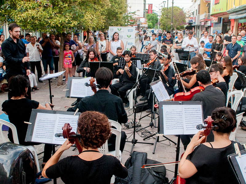 Al caer la tarde, en la peatonal Monteagudo, la Orquesta Sinfónica Municipal brindó un concierto a los vecinos del distrito, exponiendo piezas clásicas y un repertorio de música contemporánea.
