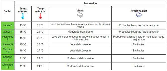 El Sistema de Previsión Meteorológica local detecta el inicio de un período marcado por la inestabilidad climatológica desde el lunes 6 hasta el miércoles 8 de noviembre con precipitaciones de variada intensidad. La rotación del viento, desde el noreste hacia el sudoeste, modifica las condiciones del tiempo: no hay registro de lluvias hasta el domingo. La temperatura mínima oscila entre los 11ºC y los 16ºC; la máxima, 27ºC.